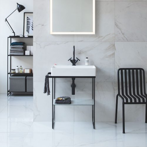 The Metal Console is available in Matt Black or Chrome. Especially flexible, as it is both height adjustable and reversible. You can choose to position the towel rail on the right or left. You can also add an additional glass shelf to provide you with more storage space. It measures 665 x 381mm and is paired with the DuraSquare Washbasin